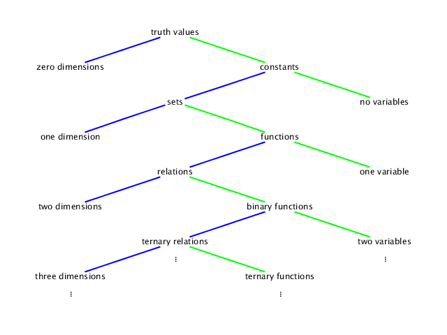That is, a truth value requires 0 dimensions to graph, a constant or a set requires 1 dimension to graph, a function or a relation requires 2 dimensions to graph, a binary function or a ternary relation requires 3 dimensions to graph, and so on; and a truth value or a constant requires 0 variables to define, a set or a function requires 1 variable to define, a relation or a binary function requires 2 variables to define, a ternary relation or a ternary function requires 3 variables to define, and so on.